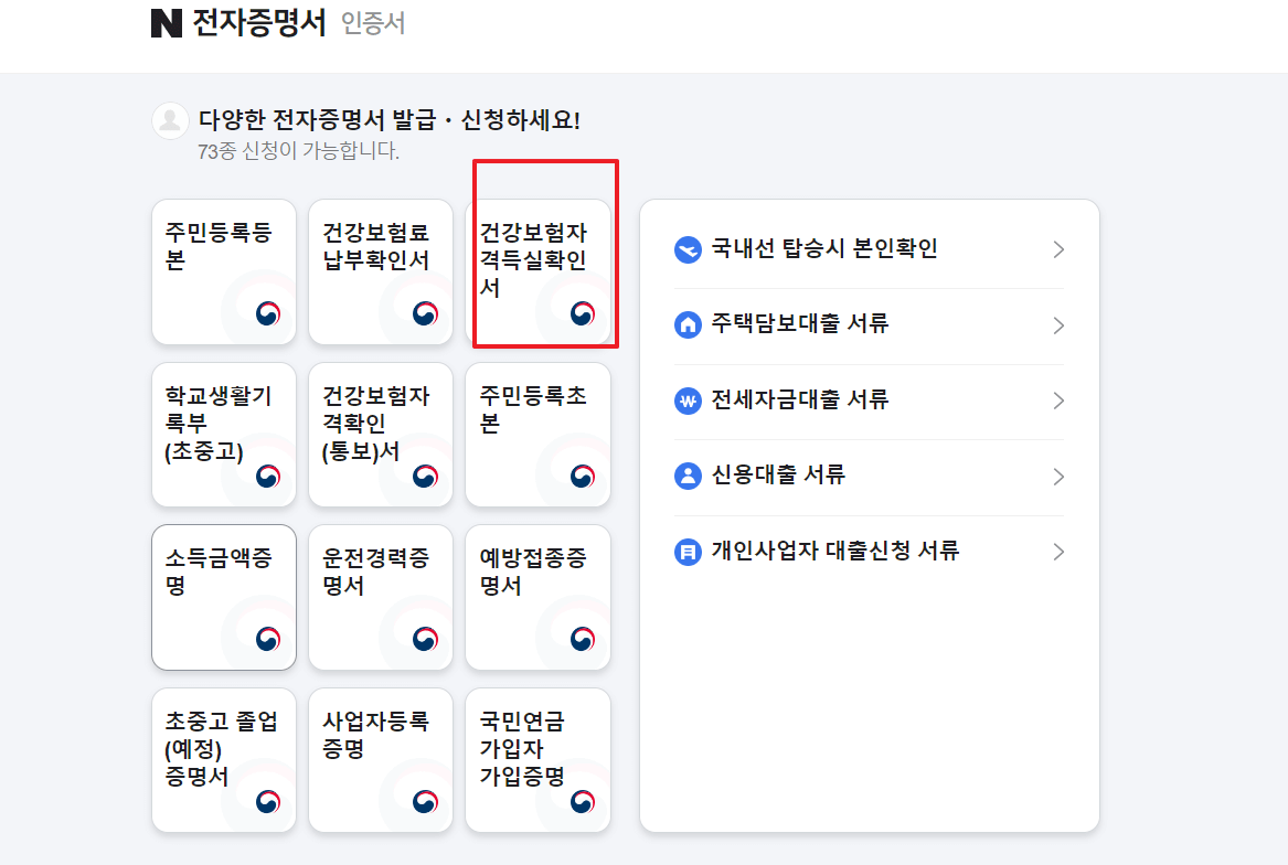 네이버 전자증명서에 들어가셔서, 건강보험자격득실확인서 메뉴를 클릭하시고 신청하시면 됩니다.