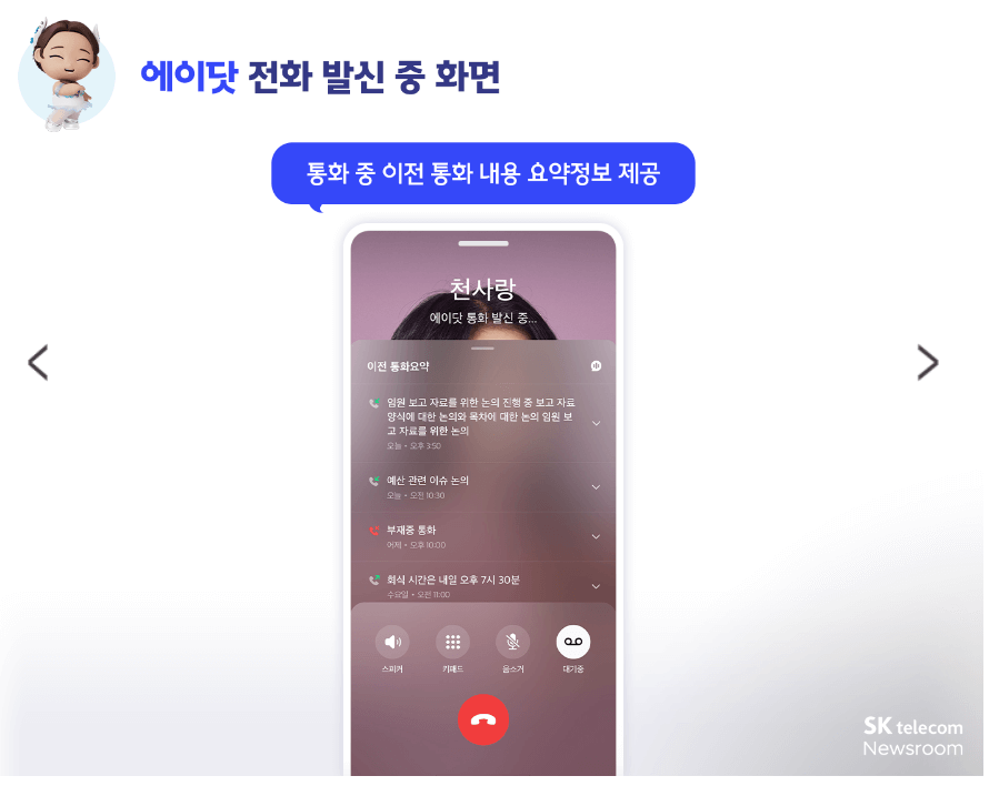 에이닷 메인화면에서 AI가 자동으로 통화내용을 요약해주고, 전화 발신 중에도 화면에서 이전 통화 내용을 보여줍니다. 이를 통해 거래처나 비즈니스 관계에서 활용하기 좋을 것으로 보입니다!
