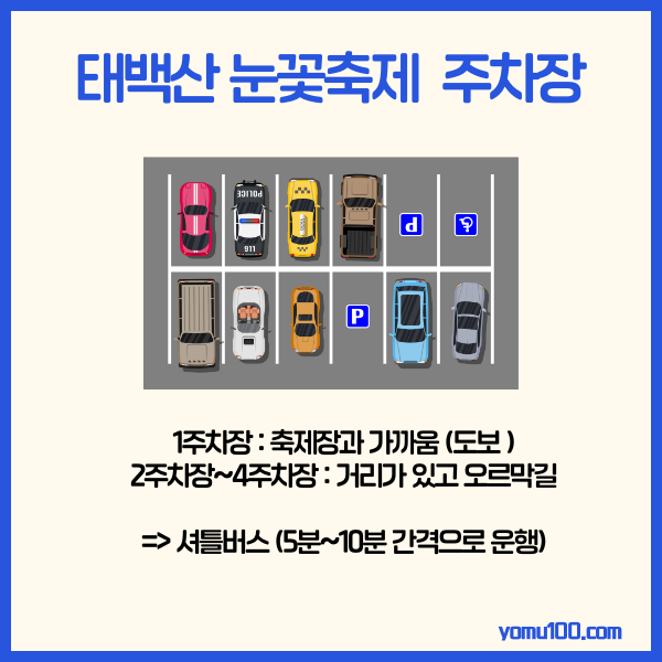 태백산 눈꽃축제의 주차장은 4곳으로 나누어져 있으며, 셔틀버스 서비스를 운영하고 있습니다.
