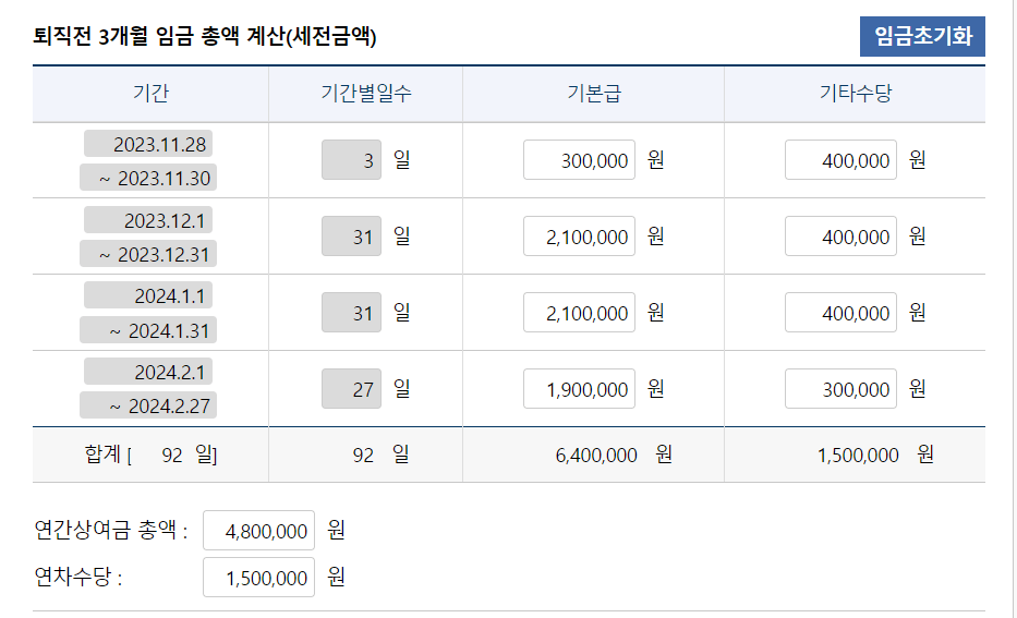 - 일자를 입력 한 후 평균임금계산보기를 클릭하면 자동으로 재직일수와 퇴직 전 3개월의 기간별 일수가 뜹니다. 재직일수는 수습기간, 휴일, 출산휴가, 육아휴직, 부상, 질병, 개인 연차까지 모두 포함됩니다.